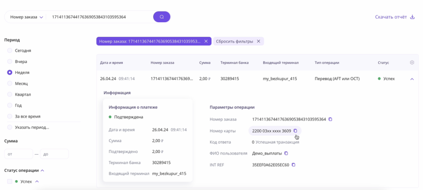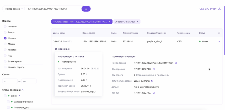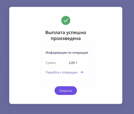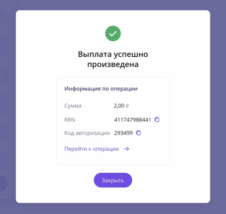 В данном окне есть кнопка «Перейти к операции», которая произведет редирект пользователя во вкладку «Операции», где автоматически будет отфильтрована последняя операция по выплате.