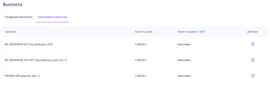 «Лимит по сумме» – максимальная сумма выплаты в течение суток, если не установлено время в столбце «Лимит по времени».