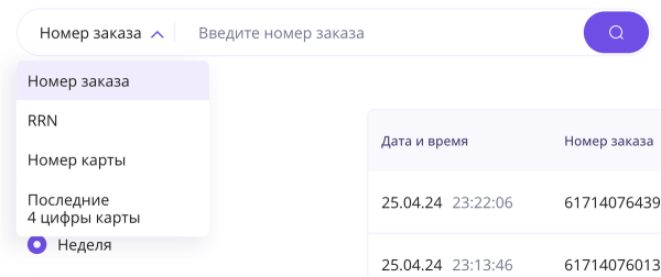 Поиск возможен по номеру заказа, RRN, номеру карты, последним 4 цифрам карты, PAN. Для конкретизации параметров поиска около поисковой строки есть выпадающий список, в котором нужно выбрать необходимый параметр.