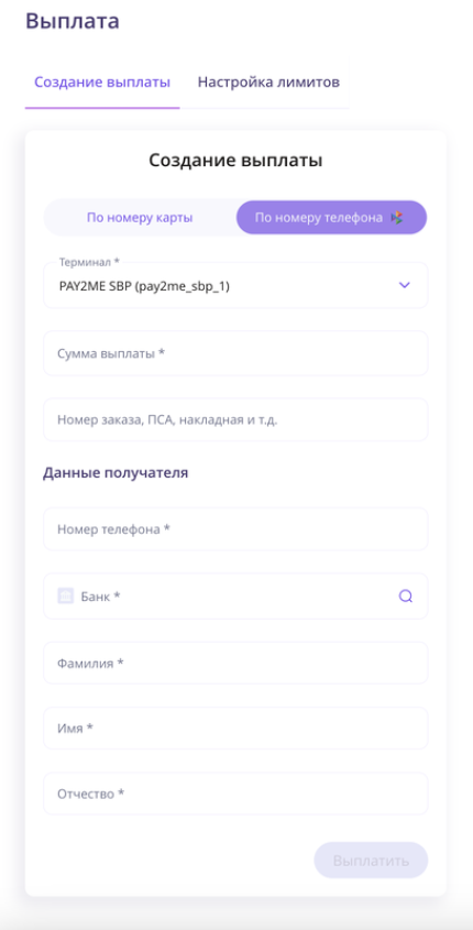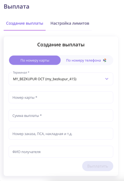 Раздел «Выплаты» опционален и будет доступен только в том случае, если эта услуга была настроена для конкретной учетной записи Пользователя Личного кабинета.