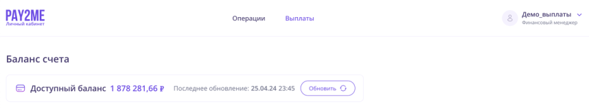 Система PAY2ME синхронизирована с балансом «внутреннего эквайрингового» счета, поэтому отдает актуальный баланс на момент запроса.