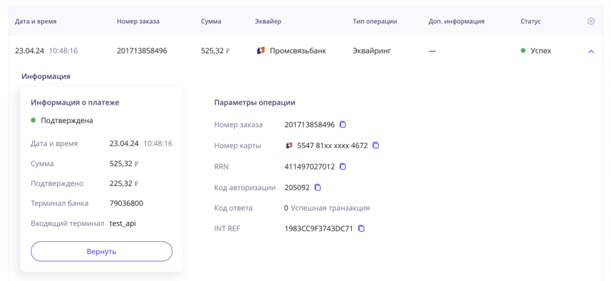 Раздел Операции доступен пользователям с любой ролью. В данном разделе можно посмотреть статусы всех транзакций и их детали.