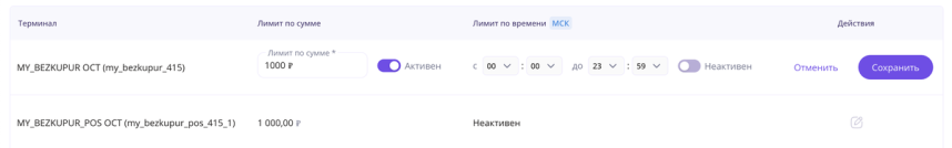 Для установки лимитов необходимо нажать на символ напротив нужного терминала в столбце «Действия»: