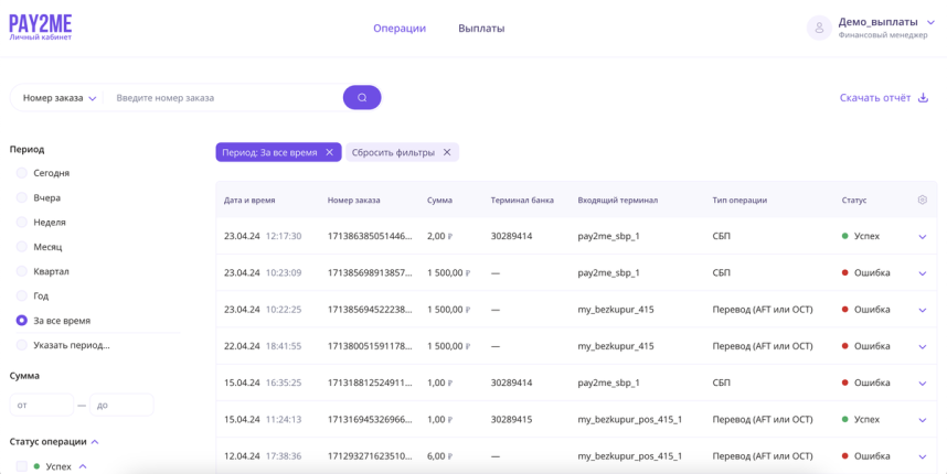 Функционал скачивания отчета доступен всем пользователям, которым доступен просмотр операций.