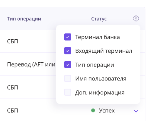 Некоторые колонки в таблице операций можно скрывать или отображать по желанию. Для этого необходимо нажать кнопку в виде шестеренки в правом углу. В выпадающем списке будут колонки, которые можно скрывать или отображать в таблице. Выбранный чекбокс – отображать колонки, не выбранный – скрыть колонки.