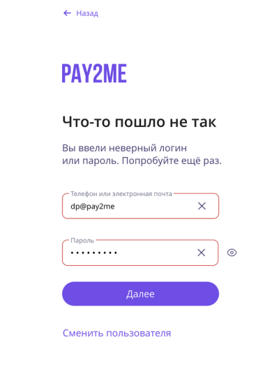 При некорректно введенном логине или пароле пользователю будет показана ошибка, что данные для входа неверны. В таком случае оба поля будут выделены красным, и пользователю нужно будет проверить логин и пароль на правильность.