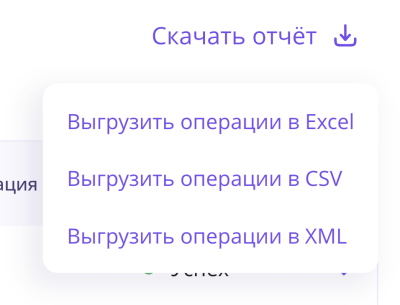 Соответствующая кнопка размещена справа вверху над таблицей операций, при нажатии отображаются доступные форматы для выгрузки, требуется нажать необходимый: