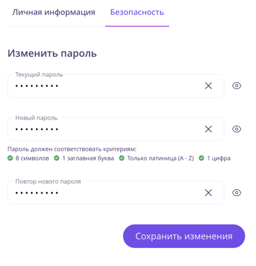 Для сохранения нового пароля необходимо нажать кнопку «Сохранить изменения» (эта кнопка станет активной только после корректно заполненных полей).
