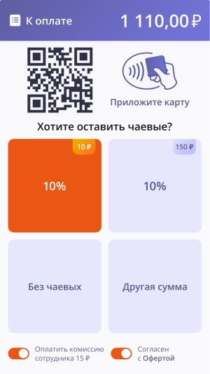 При оплате клиенту доступен ввод суммы чаевых или выбор одной из предустановленных сумм.