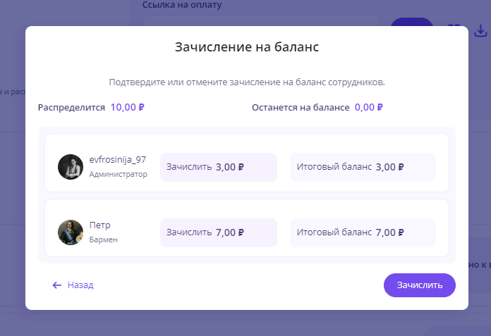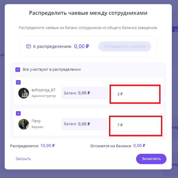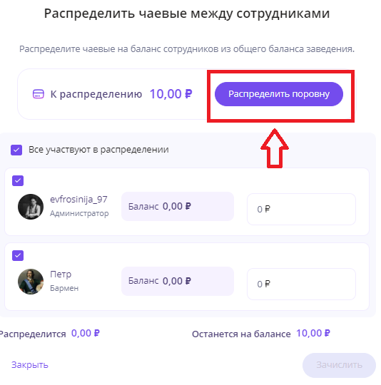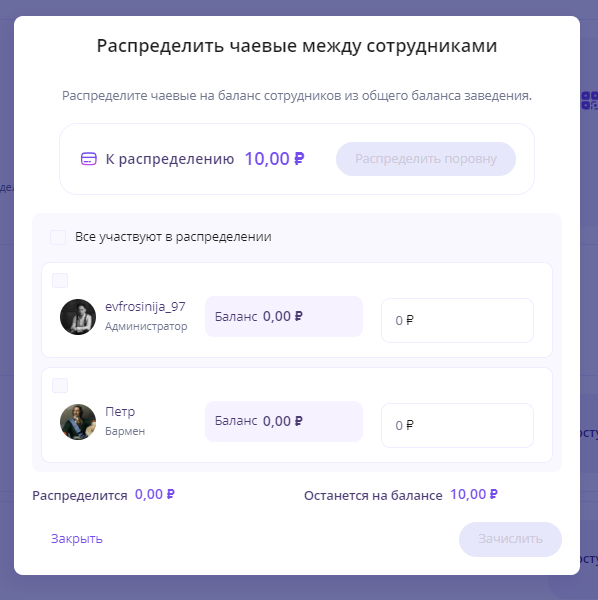 Накопленный баланс заведения можно распределить между сотрудниками, привязанными к данному заведению, для этого необходимо нажать кнопку «Распределить», которая находится под балансом заведения. После клика откроется поп-ап с функционалом распределения и полным списком сотрудников, привязанных к данному заведению:
