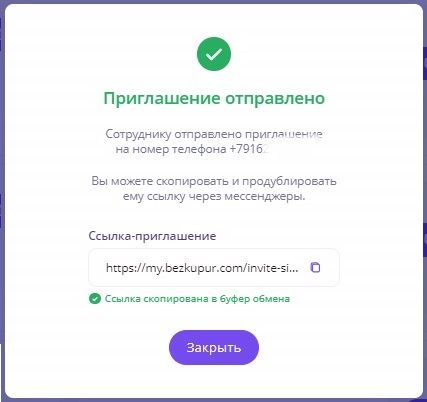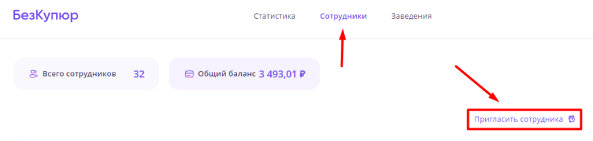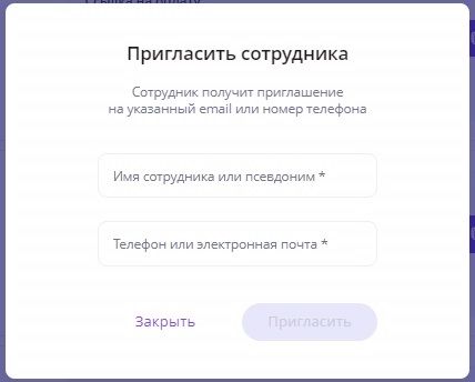 Вкладка «Сотрудники» -> кнопка «Пригласить сотрудника»