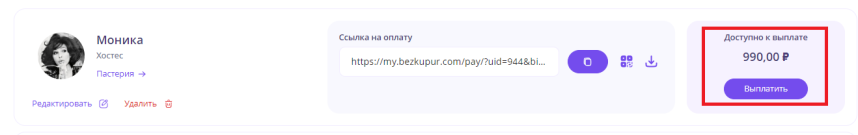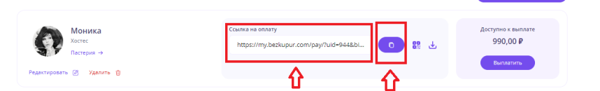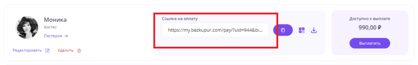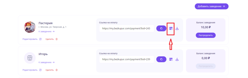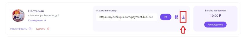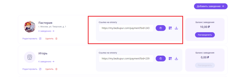 В правой части строки заведения доступна для копирования сгенерированная ссылка, по которой можно совершить оплату в пользу заведения.