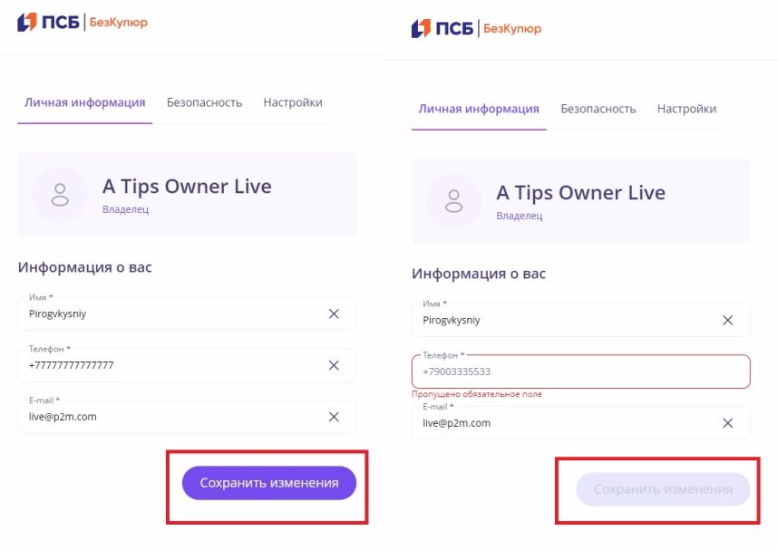 Так как все три поля обязательны для заполнения, то кнопка «Сохранить изменения» не будет активна, если не заполнено хотя бы одно поле из трех.