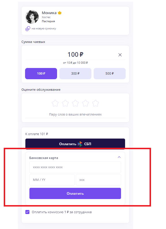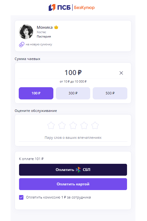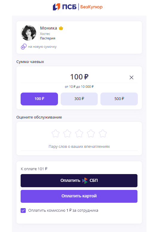 Клиент может внести произвольную сумму чаевых/выбрать предустановленную сумму, оценить обслуживание, выставив рейтинг и оставив комментарий.