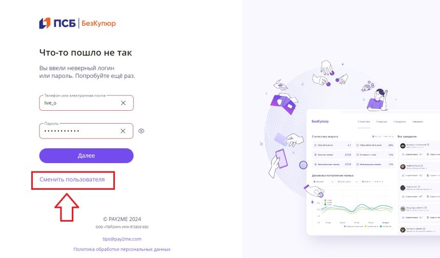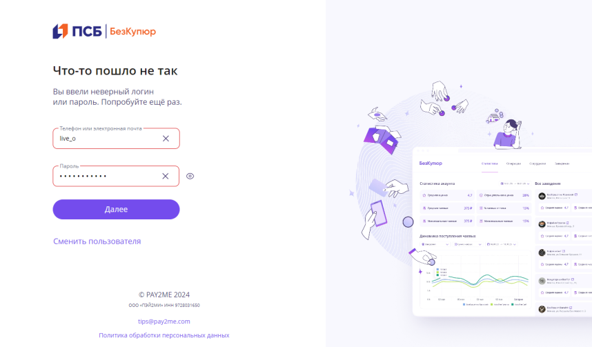 При несовпадении данных авторизация не будет осуществлена, отобразится соответствующая ошибка: