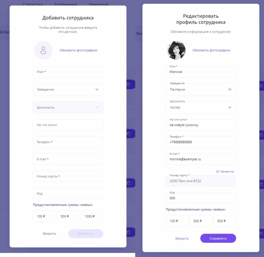 В разделе «Заведения» пользователю доступно добавление и редактирование заведений, а также распределение/вывод чаевых.