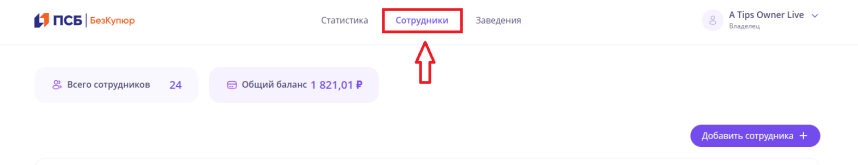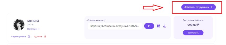 Раздел «Сотрудники» можно открыть, нажав на таб в верхнем навигационном меню. В данном разделе пользователь может добавлять новых сотрудников, управлять ранее созданными и совершать выплаты.
