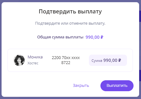 Для того, чтобы выплатить накопленные на балансе сотрудника средства, необходимо нажать на кнопку «Выплатить» под суммой баланса в карточке сотрудника, после чего откроется поп-ап с возможностью выплаты.