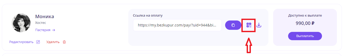 При считывании QR-кода плательщик попадает на страницу сотрудника и видит его данные, внесенные при заведении карточки сотрудника
