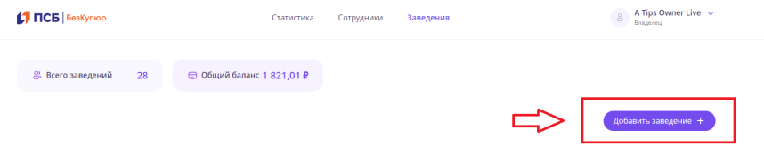 Раздел «Заведения» можно открыть, нажав на таб в верхнем навигационном меню