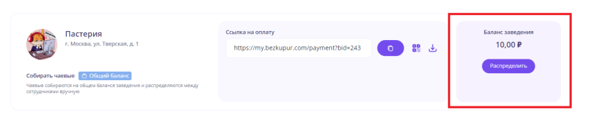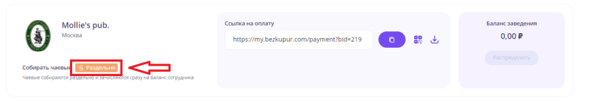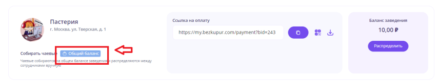 Опция “Общий баланс” подразумевает, что все средства, поступившие через платежные страницы сотрудников, будут копиться на общем счете заведения. Их можно будет распределить в любой момент времени между сотрудниками заведения.