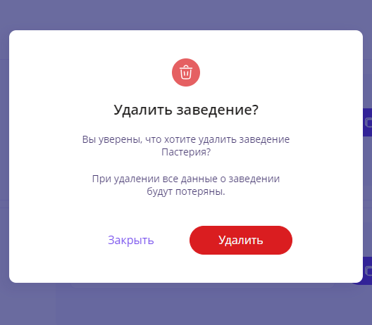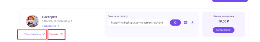 Удаленные заведения восстановить нельзя. В случае удаления заведения с ненулевым балансом необходимо предварительно распределить весь оставшийся баланс на сотрудников.