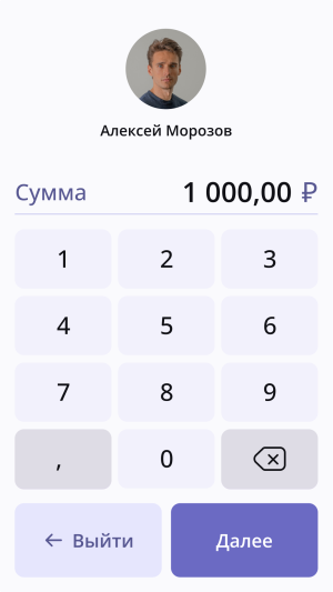 После ввода Кода официанта на странице ввода суммы в верхней части экрана будет отображена информация о сотруднике, которому принадлежит введенный Код официанта.