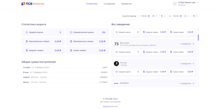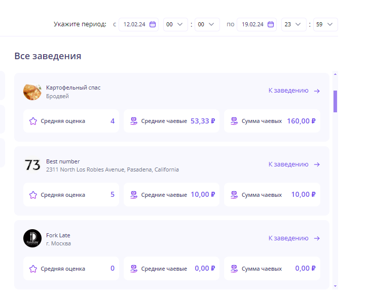 В блоке «Все заведения», размещенном справа, доступна для ознакомления информация о средней оценке работы сотрудников, средней и общей сумме чаевых в разрезе всех зарегистрированных Заведений за выбранный период: