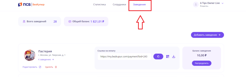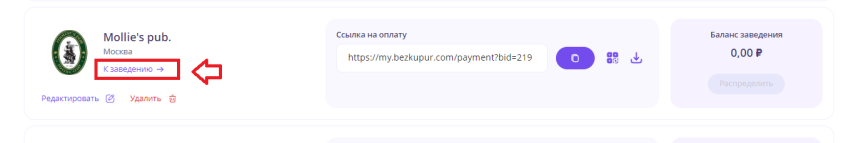 Для дополнительной проверки того, что баланс был распределен, можно нажать на кнопку «К заведению»