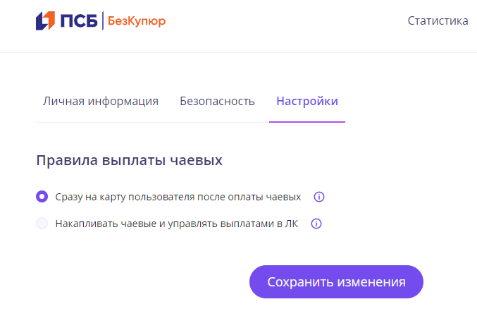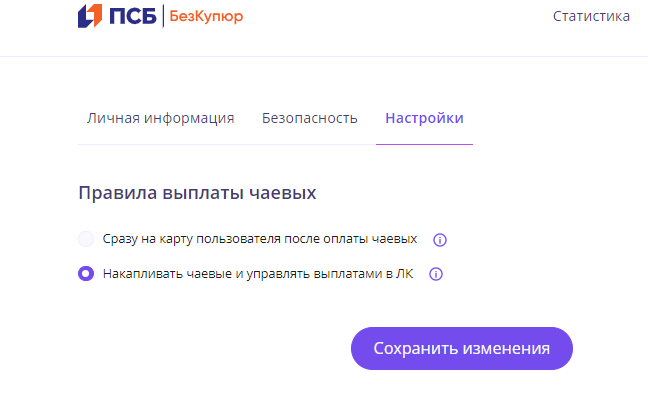 Далее нужно открыть раздел «Настройки» и выбрать первую опцию «Сразу на карту пользователя после оплаты чаевых», после чего нажать на кнопку «Сохранить изменения».