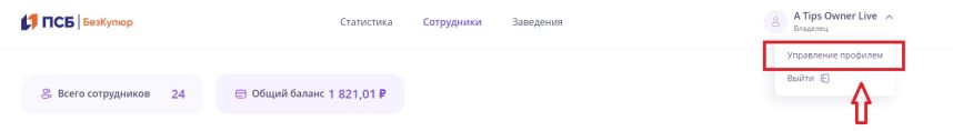 Для того, чтобы накапливать средства на балансе сервиса, а позже выплачивать их на карту сотрудника, необходимо перейти в раздел «Настройки» в «Управление профилем» и выбрать опцию «Накапливать чаевые и управлять выплатами в ЛК».