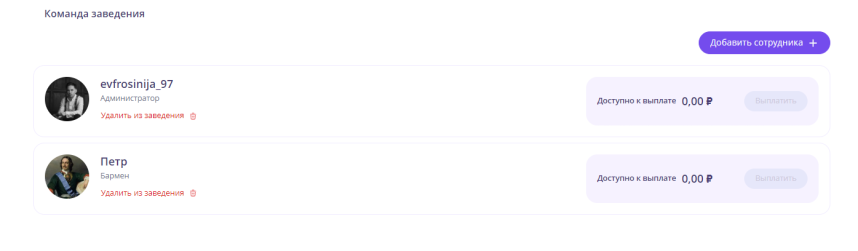 Откроется страница, где можно просмотреть список сотрудников этого заведения, их баланс, а также осуществить выплату.