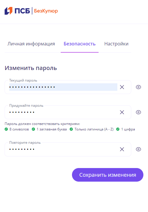 Раздел “Безопасность” содержит в себе функционал изменения пароля: