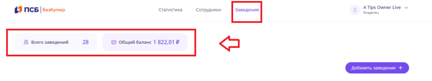 Посмотреть баланс заведения можно в разделе «Заведения», баланс будет отображен в правой части карточки: