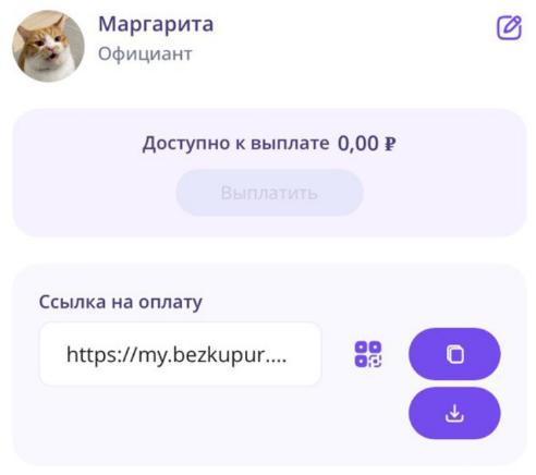 После внесения информации и сохранения данных в карточке сотрудник попадает в основной раздел своего Личного кабинета, где можно скопировать ссылку/скачать QR-код для перехода на страницу перечисления чаевых.
