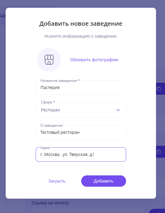 На усмотрение пользователя при создании заведения также можно внести информацию о заведении, адрес заведения и загрузить фотографию заведения