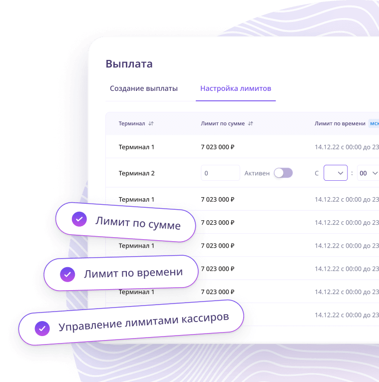 Управление лимитамиУстанавливайте лимит выплат на день, сумму на промежуток времени с… по… для каждого терминала и лимит для конкретных сотрудников