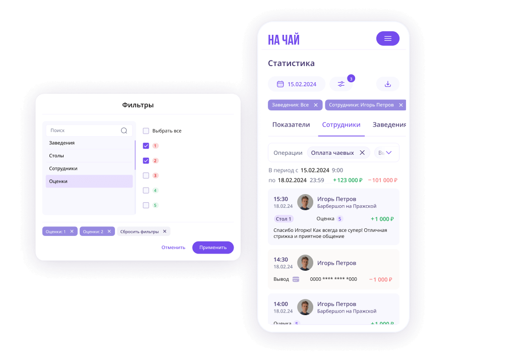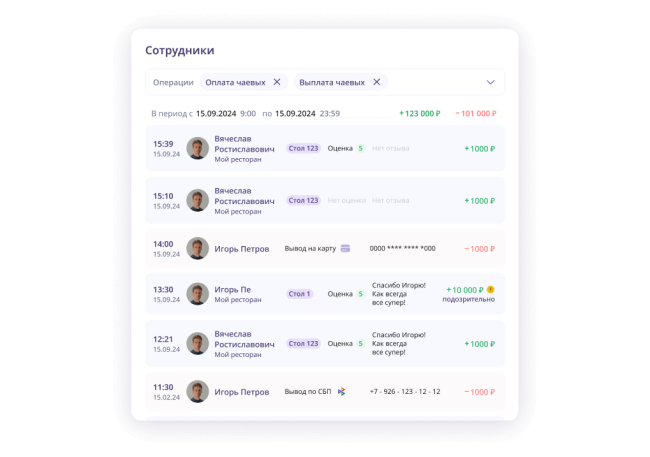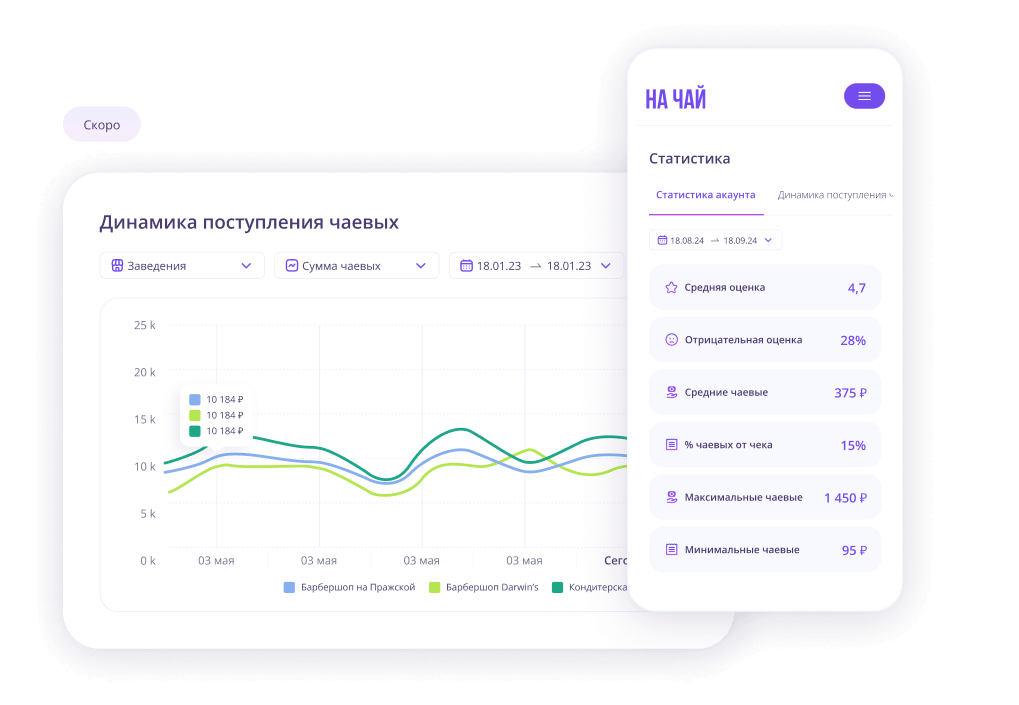Cтатистика чаевыхСледите за поступлениями чаевых и отзывами, анализируйте статистику и добивайтесь новых результатов