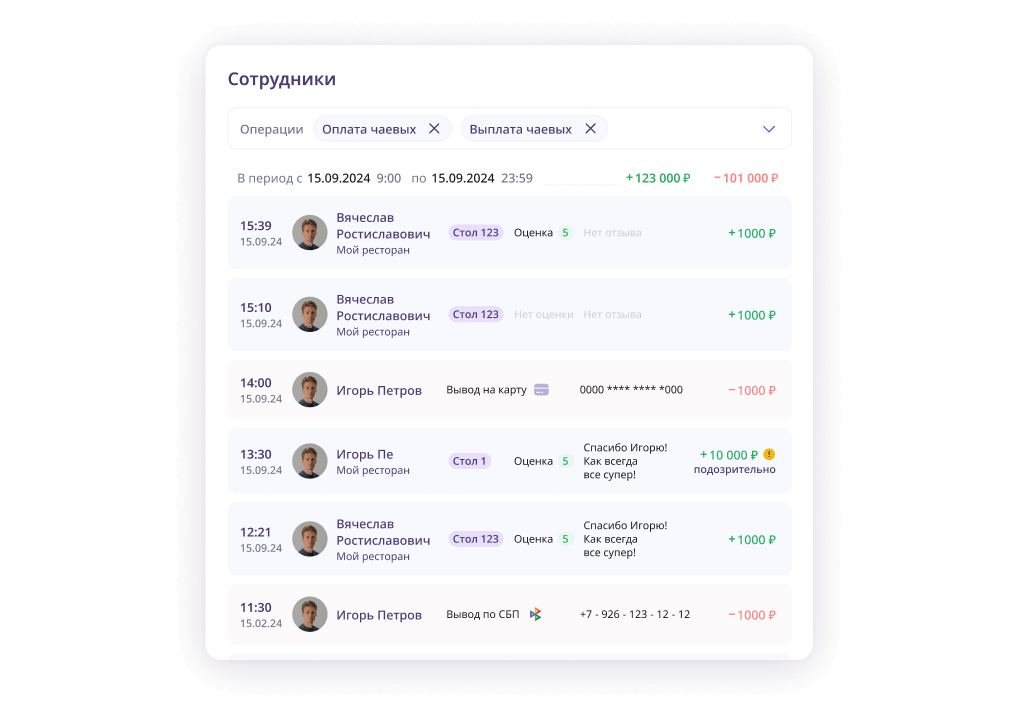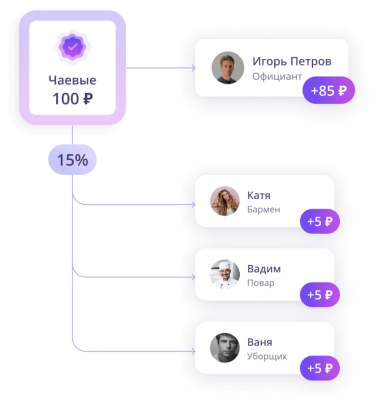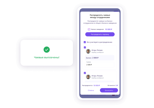 Pаспределение чаевыхРаспределяйте чаевые между сотрудниками: поровну или индивидуально