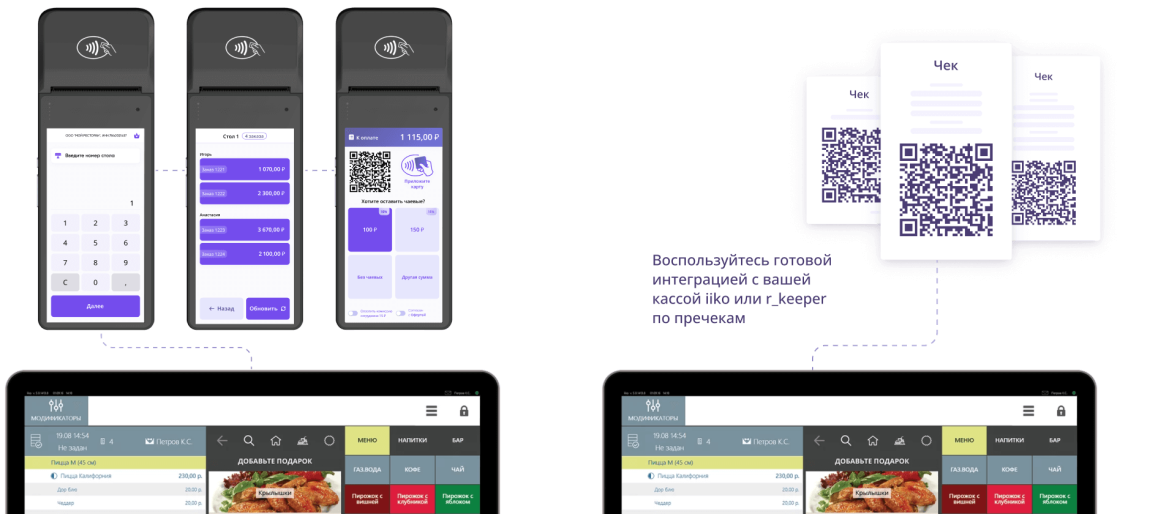 - Гость сканирует QR-код на пречеке и оплачивает счет, указав размер чаевых