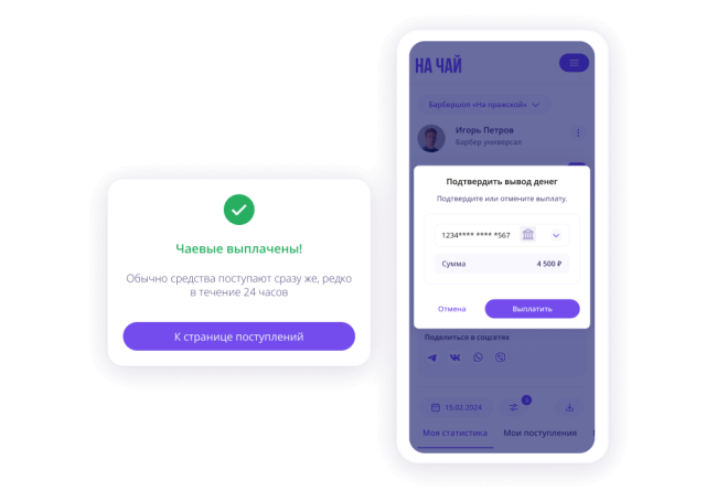 Вывод чаевыхНакапливайте чаевые на балансе и выводите на карту в любое время